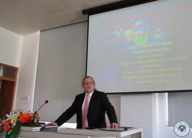 11月6日上午,新西兰著名经济学家,维多利亚大学经济与金融学院院长Morris Altman教授与Adrian Slack博士应厦门大学新西兰研究中心的邀请来我院的“公共事务论坛”分别作了题为《High Wage Economics and New Zealand Relative Productivity Dilemma》和《Fiscal and Economic impacts of immigrants to New Zealand》讲座。