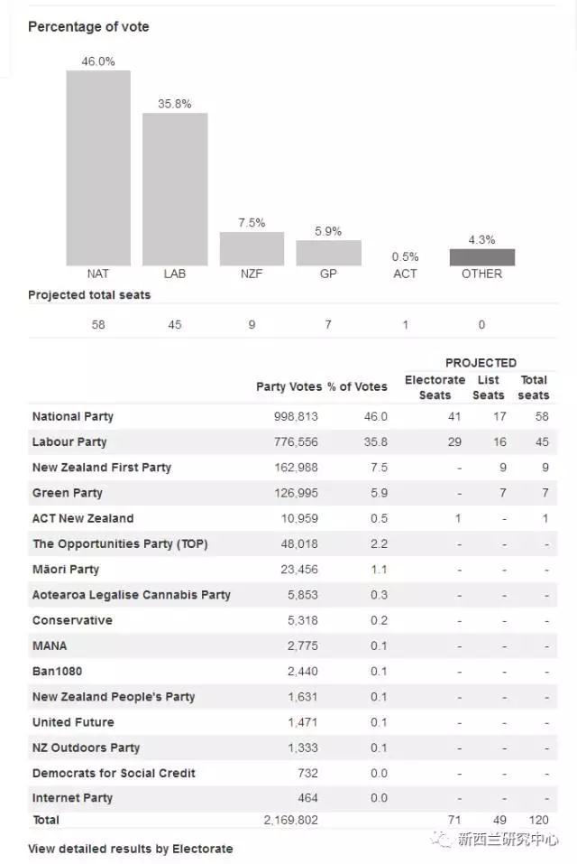 新西兰有120个议席,根据比例,各自政党获得的议席分别为:现在的执政国家党获得58个席位,超过原来民调一度领先的工党13个席位,因此,国家党具有优先组阁权。新西兰优先党和绿党分别获得9个和7个席位。