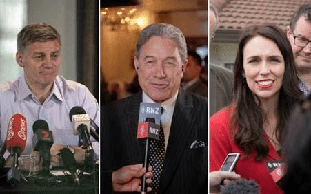 左起:国家党领袖Bill English,优先党Winston Peters,工党Jacinda Ardern