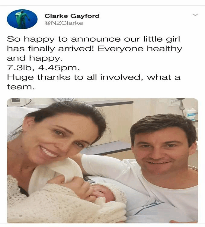 在今年的1月19日,新西兰总理Jacinda Ardern通过社交网络Twitter宣布自己怀孕的消息,她称自己是在去年10月13日知道自己怀孕的。Ardern和伴侣Clarke Gayford称,他们的第一个孩子将在今年6月降生,在6个星期的产假期间,将由副总理Peters代行总理职权。